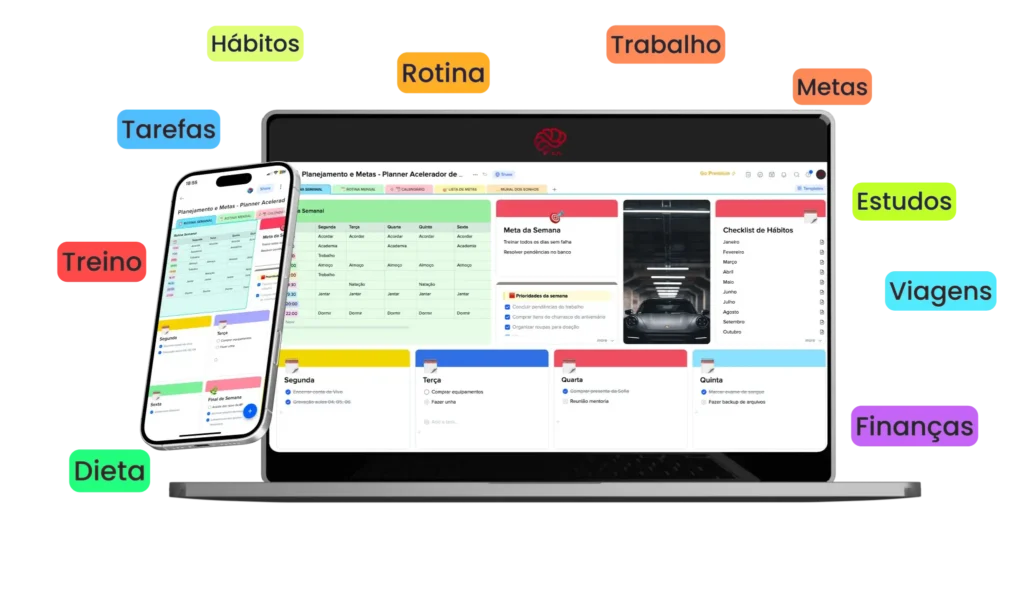 Com seções prontas pra organizar todas as áreas da sua vida, rotina, metas, hábitos, finanças, alimentação e bem-estar.